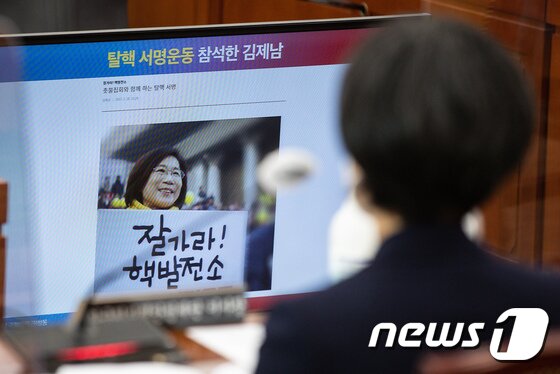 발언하는 김제남 원자력안전재단 이사장. 이날 국감에선 전 정권 임기 막판에 임명돼 탈원전 알박기 논란이 일었던 김제남 한국원자력안전재단 이사장의 거취 문제도 뜨거운 쟁점이었다. 특히 국민의힘은 문재인정부 때 임명된 김제남.